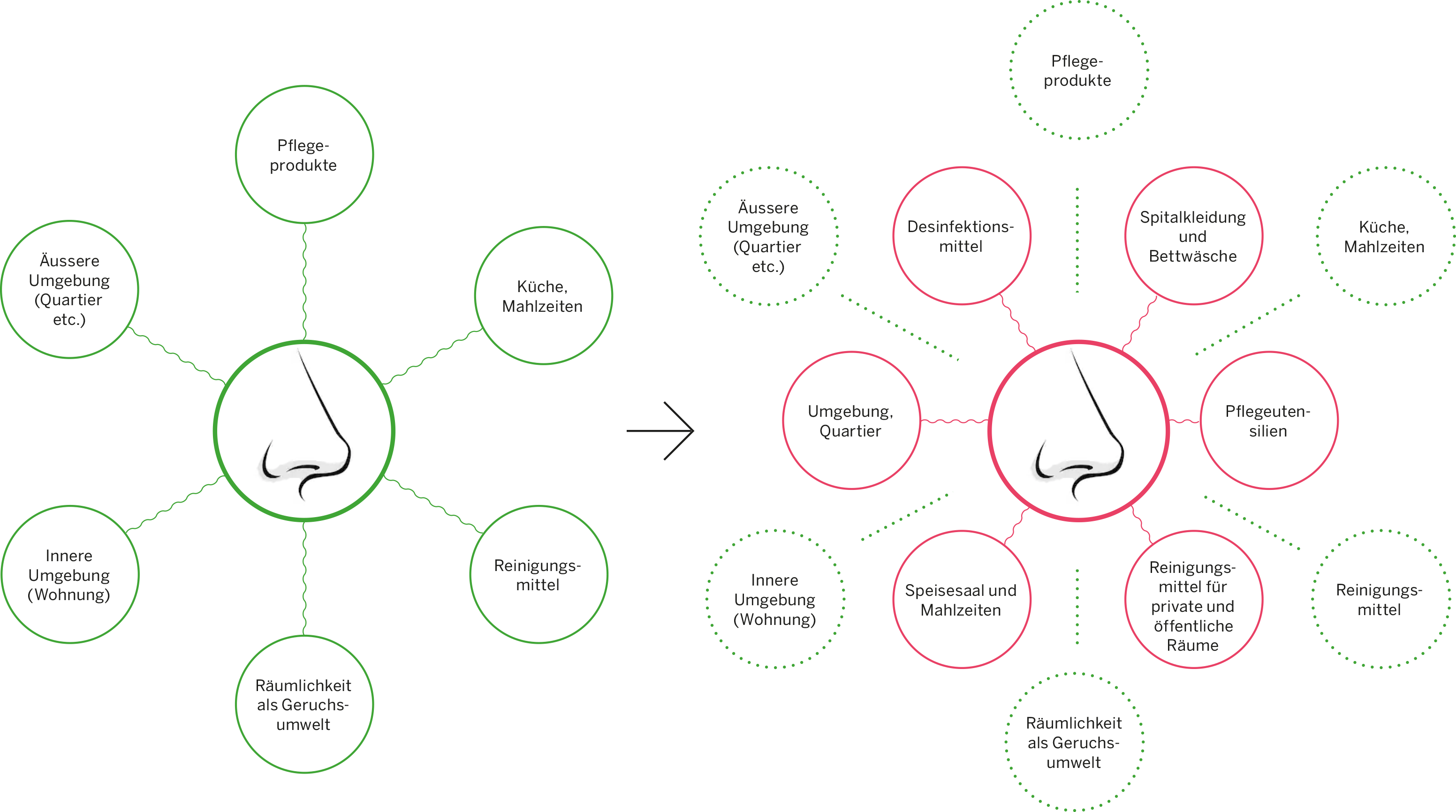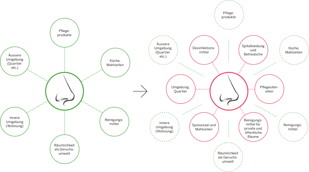 Diese Veränderungen im neuen räumlichen und sozialen Gefüge konfrontiert Bewohnende auch mit neuen Geruchssituationen. Anstelle der vertrauten Geruchsumgebung in der eigenen Wohnung sind es nun vermehrt fremde und invasive Gerüche aus dem Pflegealltag, die sie wahrnehmen.